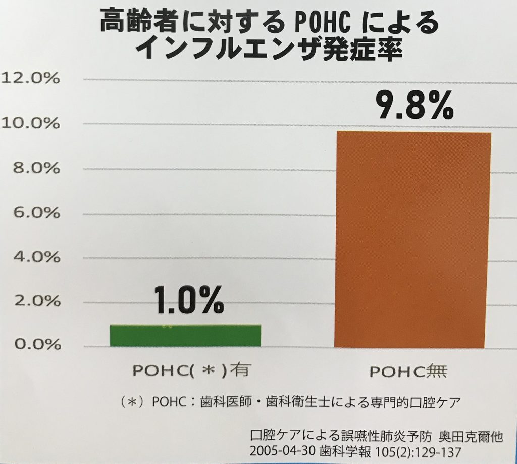 歯医者で治療や口腔ケアを受けることによって、感染症リスクは大きく減らすことができるという統計結果もあります。インフルエンザの流行期に歯科衛生士による口腔ケアを受けた人と受けなかった人を比較したところ、インフルエンザ発症率は、受けた人は1.0%、受けなかった人は9.8%という結果です。