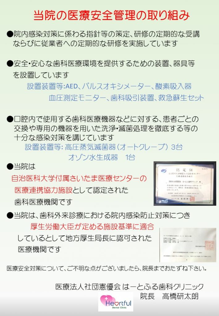 当院では、来院される方々が安心して処置を受けられるように、可能な限りの院内感染防止策を講じてお迎えしております。新型コロナウイルスを初めとした感染症に対し積極的に予防をしていきましょう。